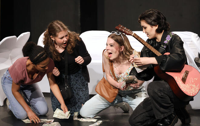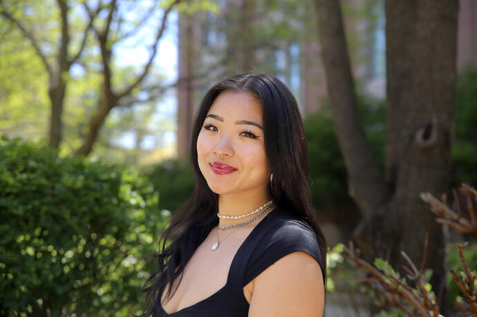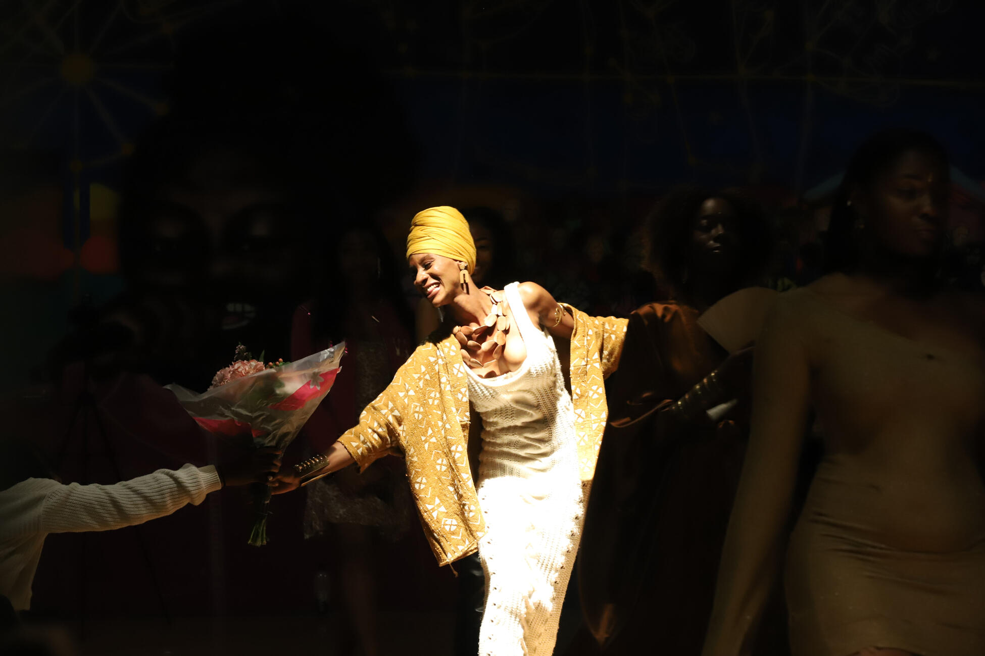 Yasmeen Wilson, a Fashion Design student at Columbia College Chicago, accepts flowers from a loved one at the Fusion Fashion Show on April 29, 2024. The Fusion Fashion was a chance for student designers like Wilson to showcase their work for one last time as the semester ended.