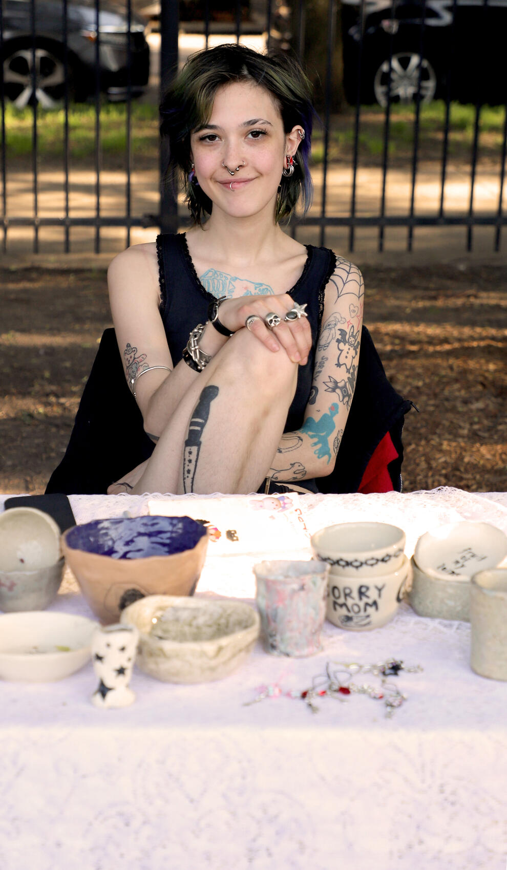Andy Cordos, a Chicago college student poses with her pottery at Grant Slam in Jonquil Park in Chicago on May 18, 2024. They have been making pottery for 5 years, after discovering their love for it in a college course. The festival allowed students to enjoy themselves and vendors, like Cordos to showcase their work.