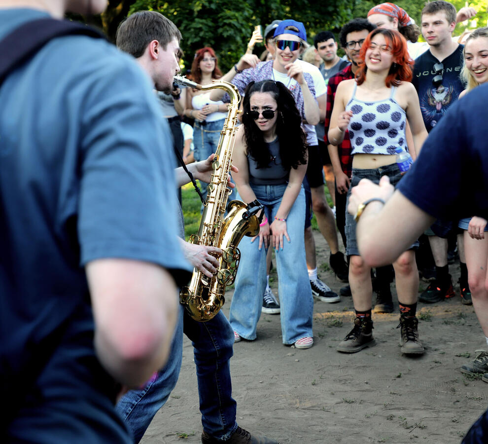 DZ Riley’s saxophonist and lead singer step down from the stage to get up close and personal to the overjoyed crowd at Grant Slam in Jonquil Park in Chicago on May 18, 2024.