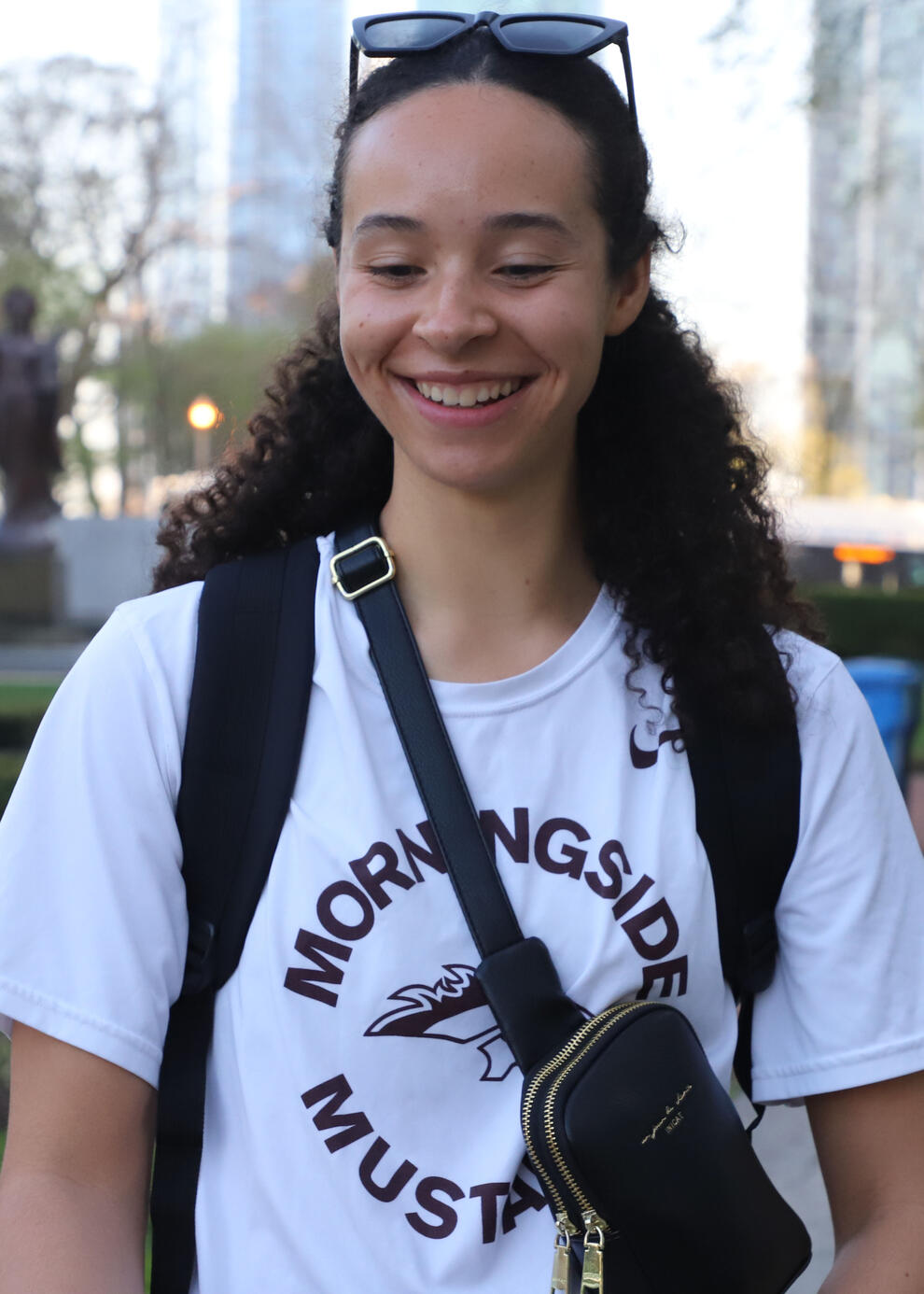 Mariah Krzanowski, a model, stops for a picture as she walks her dog Sonny through Grant Park on April 14, 2024.