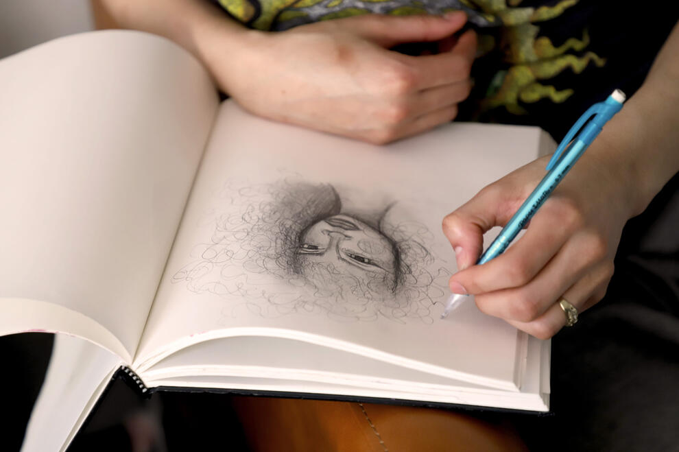 Kentay Varnell, a Chicago resident, student, artist, and creator, draws an original character in her sketchbook in her apartment on April 18, 2024.