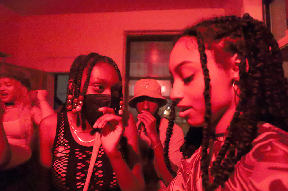 Kiya Dunigan, left, and Lauren Martin, right, talk and dance at a local party celebrating Black & Brown communities, thrown by a mutual friend in Chicago on May 31, 2024. The party created a safe space for music between BIPOC and LGBTQ+ communities to be uplifted and creativity to flow.