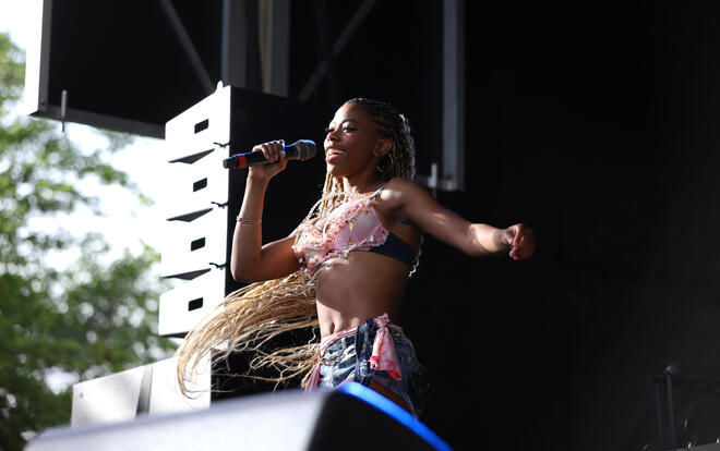Festivalgoers kick and dance as DZ Riley performs their set at Grant Slam in Jonquil Park, Chicago on May 18, 2024. The student-run music festival was a chance for the surrounding community to celebrate independent music curators and performers, and to enjoy themselves.